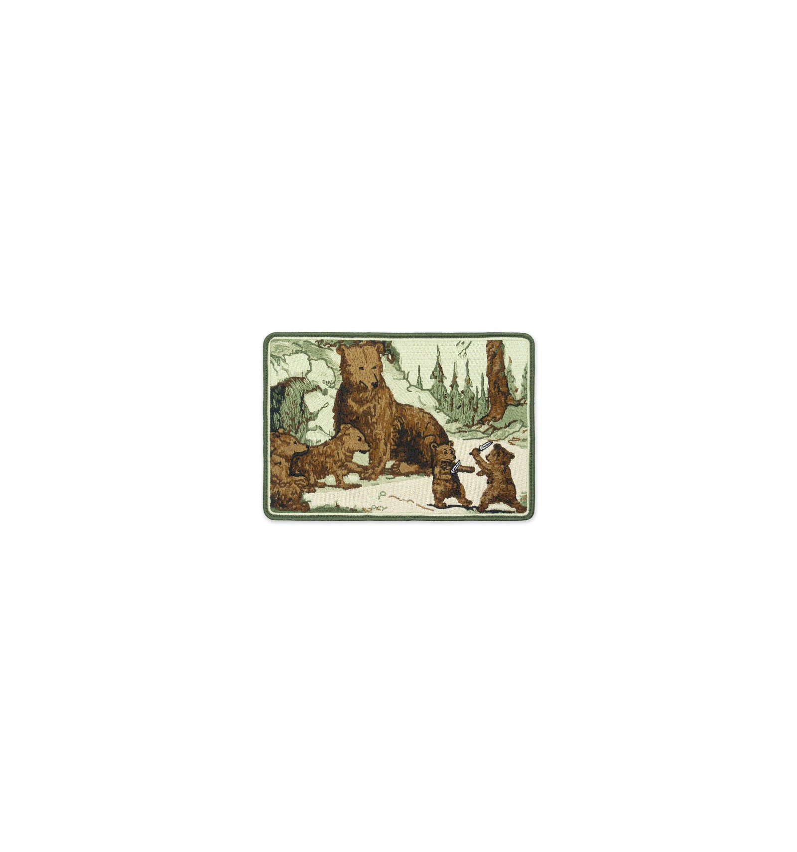 Réalisé dans le style des illustrations classiques de livres sur la vie en plein air des années 1930, ce grand écusson moral (le plus grand que nous ayons jamais réalisé afin de capturer les détails) présente une version originale d'oursons printaniers qui ne font pas que jouer, mais qui s'entraînent au combat avec des couteaux.